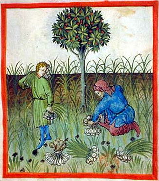 49. Gathering garlic; Tacuinum Sanitatis, 15th c., Paris.