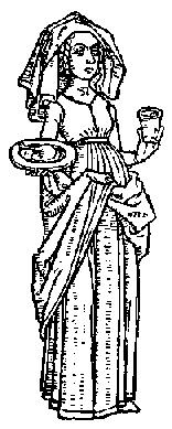 24. Serving lady; detail of a woodcut from a Dutch block-book edition of Ars Moriendi, 1465.