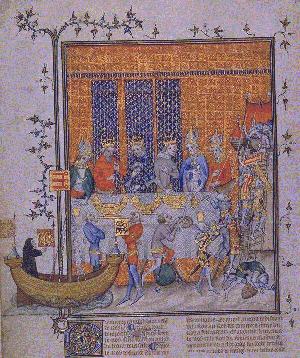 An elaborate banquet featuring a pantomimic siege is described in The Franklin's Tale: "For often at feasts, I have heard told, that magicians within a large hall, have made appear water and a barge, and made it sail up and down the hall. Sometimes there seemed to appear a fierce lion; and sometimes flowers sprang up as in a meadow; sometimes a vine and white and red grapes; sometimes a castle made of stone and mortar; and when they pleased made it disappear." Such spectacles, designed for the entertainment of feasters, were common during Chaucer's period. On January 6, 1378, Charles the V of France entertained the Emperor Charles IV in the Royal palace of Paris with a pantomime representing the arrival of the Crusaders and the capture of Jerusalem in 1099. |