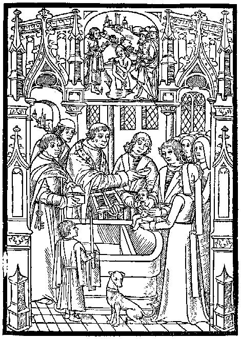16. Baptism, from L'Art de bien Vivre et de bien Mourir, Paris 1492.