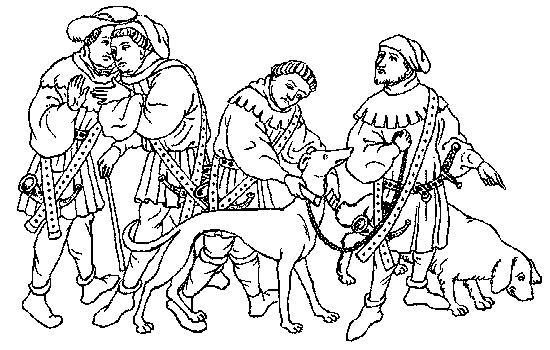 34. A group of huntsmen listening to the orders of their master; from Livre de la Chasse et les Oraisons de Gaston Phébus, early 15th century.