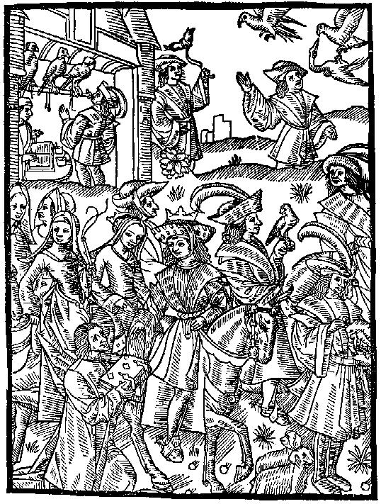 58. Royal Hawking Party, with the Author presenting his book, from Tardif, L'Art de Faulconnerie, Paris 1492-93.