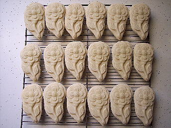 (The picture above is of the mold, and not the cookie itself) Size: S (3 1/8" x 1 7/8"). Shape: irregular. Price: 1 - $.50; 6 - $3.00; 12 - $6.00; 50 - $25.00; 100 - $40.00. S & H: $8.00 for every 100 cookies. ![]() Notes: What a lovely little cookie! Its shape & design are truly unique - this is a real eye-catcher. ![]() A batch of Elizabethan Roses, fresh out of the oven! HOW TO PLACE AN ORDER (Please contact us before placing any order.) Pay by PayPal! Click the "Buy Now" Link: