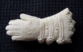 (The picture above is of the mold, and not the cookie itself) Size: S (1 3/8" x 2 5/8"). Shape: free-form. Price: 1 - $.50; 6 - $3.00; 12 - $6.00; 50 - $25.00; 100 - $40.00. S & H: $8.00 for every 100 cookies. Notes: A gage is the glove thrown down to announce the challenging of a duel; with a small heart design on the palm, this could very well be the "gage of love." This cookie is trimmed so that it looks just like a little glove - a platter full is a very impressive site! Jim likes eating these with ice cream - the fingers & palm make a tasty little scoop to eat the ice cream with! ![]() HOW TO PLACE AN ORDER (Please contact us before placing any order.) Pay by PayPal! Click the "Buy Now" Link: