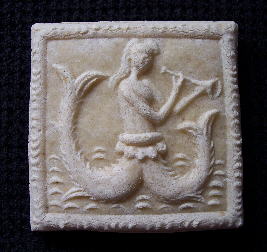 from the water, a double-tailed siren blows a long trumpet;