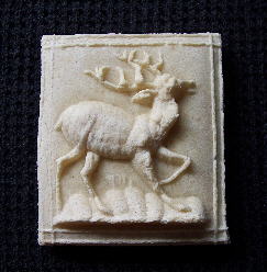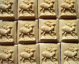 Size: S (1 7/8" x 2 3/8"). Shape: square. Price: 1 - $.50; 6 - $3.00; 12 - $6.00; 50 - $25.00; 100 - $40.00. S & H: $8.00 for every 100 cookies. Notes: This has become one of our more popular designs when we sell at medieval & Renaissance events; many people seem to relate to the imagery in a personal way. The deer is fairly deep and stands out quite well from the background. This cookie looks wonderful when done in one of our honey flavors - the honey gives the cookie a golden-brown cast that looks particularly appealing with this design. ![]() A batch of Woodland Stags, done in golden-brown honey. (Please contact us before placing any order.) Pay by PayPal! Click the "Buy Now" Link: We accept: