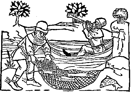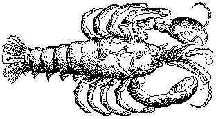 - Lawrens Andrewe PAGE THREE Cancer the Creuyce "Cancer the creuyce is a Fishe of the see..." Cancer the creuyce is a Fishe of the see that is closed in a harde shelle, hauyng many fete and clawes / and euer it crepeth bacward / & the he hathe two pynnes on his bely, & the she hathe none / whan he wyll engender, he climmeth on her bake, and she turneth her syde towardes him, & si they fulfyll their workes. In maye they chaunge their cotes, & in winter they hyde them fiue monethes during / whan the creues hath dronken milke it may leue longe without water. when he is olde, he hathe ij. stones in his hed with rede spottes that haue great vertue / for if they be layde in drynke / they withdryue the payne frome the herte. the creuyce eteth the Oysters, & geteth them be policye / for whan the oyster gapeth, he throweth lytell stones in him, and so geteth his fishe out, for it bydeth than open. The Asshes of hym is gode to make white tethe / & to kepe the motes out of the clothes / it withdryueth byles, & heleth mangynes. The creuyce of the fresshe water geueth gret fode, but it is an heuy mete to disieste. Cancer the crayfish is a fish of the sea that is enclosed in a hard shell, with many feet and claws, and it always walks backwards. The male has two pins on his belly, and the female has none. When they mate, the male climbs on the female's back, and she turns her side towards him, and so they fulfill their duties. In May they change their coats (shed their outer shell), & they hide for five months during winter. When the crayfish has had milk to drink, it may live a long time without water. When he is old, it has 2 stones with red spots in his head that have great virtue, for if these stones are placed in a drink they take the pain away from anything that hurts. The crayfish eats oysters, and gets them by a certain method. When the oyster shell opens, the crayfish throws little stones into it, and so gets the fish, for the shell stays open. Crayfish ashes are good for whitening teeth, and it keeps the moths out of clothes. It removes biles and heals mange. Fresh-water crayfish is very good to eat, but it is a heavy food to digest. Caucius Caucius is a fisshe that will nat be taken with no hokes / but eteth of the bayte & goth his way quyte. The Caucius is a fish that can't be taken with a hook; it eats the bait and goes on its way. Capitaius Capitaius is a lytel fisshe with a great hede / a wyde rounde mouthe / & it hydeth him vnder the stones. The Capitaius is a little fish with a big head & a wide, round mouth, and it hides itself under stones. "... a lytel fisshe with a great hede a wyde rounde mouthe... " Carpera "... than the nette slyppeth ouer him whiche way soeuer it come" Carpera is a carpe, & it is a fysshe that hathe great scales / and the female hathe a great rowghe, & she can bringe forthe no yonges tyll she haue receyued mylke of her make / & that she receyueth at the mouth / and it is yll for to take / for whan it perceyueth that it shalbe taken with the net, than it thrusteth the hede into the mudde of the water / and than the nette slyppeth ouer him whiche way soeuer it come; & some holde them fast be the grounde, grasse / or erbis, & so saue themselfe. The Carpera is a carp, & it is a fish that has large scales. The female is colored red, and cannot give birth until she takes into her mouth her own milk. The carpera is very hard to catch, for when it percieves that it is going to be taken in a net, it thrusts its head into the mud of the water, and then the net slips over the carpera no matter how it comes; and some hold themselves fast to the ground, grass, or herbs, & so save themselves. Cetus "Cetus is the greatest whale fisshe of all... " Cetus is the greatest whale fisshe of all / his mouthe is so wyde that he bloweth vp the water as yf it were a clowde / wherwith he drowneth many shippes / but whan the maryners spye where he is / than thei accompany them a gret many of shyppes togeder about him with diuers instrumentis of musike, & they play with grete armonye / & the fische is very gladde of this armonye / & commeth fletynge a-boue the watere to nere the melody, & than they haue amonge them an instrument of yron, the whiche they festen in-to the harde skinne, & the weght of it synketh downwarde in to the fat & grese / & sodenly with that al the instrumentes of musike be styll, and the shyppes departe frome thens, & anone he sinketh to the grownde / & he feleth that the salt watere smarteth in the wounde, than he turneth his bely vpwaerd and rubbeth his wownde agaynst the ground, & the more he rubbeth, the depere it entreth / & he rubbeth so longe that he sleeth hymself / and whan he is dede, than commeth he vp agayne and sheweth him selfe ded / as he dyd before quicke / and than the shippes gader them togeder agayne, and take, & so lede hym to londe, & do theyr profyte with hym. The Cetus is the greatest whale fish of all. His mouth is so wide that he blows up the water as if it were a cloud, and in doing so drowns many ships. But when the mariners spy where he is, they gather around him in many ships with various musical instruments, & they play with great harmony. And the fish is very glad of this harmony & comes floating above the water to be near the melody. Then they have among them an instrument of iron (a harpoon), which they fasten into the Cetus' hard skin, and the weight of the harpoon sinks down into the fat & grease. With that, the musical instruments suddenly become still and the ships depart from there, and soon the Cetus sinks to the ground. When he feels the salt water smarting in his wound, he turns his belly upward and rubs the wound against the ground, and the more he rubs the deeper the harpoon enters, & he rubs so long that he slays himself. And when he is dead, he comes up again quickly as he did before and shows that he is dead. Then the ships gather together again, and take the Cetus and lead it to land, where they make a profit from it. "..