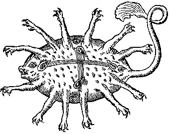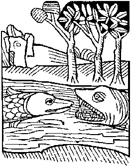 "they be rounde lyke a ringe... & is full of sharpe finnes & pinnis" Rubus is a fisshe of the grekes se & of the sees of ytaly / they be rounde lyke a ringe, & haue many rede spottes / & is full of sharpe finnes & pinnis / he is slow in swimmynge because he is so brode / he gothe be the grounde, & wayteth there his praye / & suche fisshes as he can gete he burieth in the sandes, & it is a very swete fisshe. The Rubus is a fish of the Greek sea & of the seas of Italy. They are round like a ring, & have many red spots & are full of sharp fins & spikes. He is a slow swimmer because he is so big. He goes to the ground, & waits there for prey, & whatever fish he gets he buries in the sand. It is very delicious fish to eat. The above illustration is from Konrad Gesner's Historia Animalia Liber IV (2nd edition, 1604) and shows a sea creature sighted between Antibes & Nice in 1562. Ryache Ryache be fisshes that be rounde / somtyme they be in length & brede two cubites / & it hath a long tayle / theron be sharpe pinnes / & it is slowe in swimmynge. The Ryache are fish that are round. Sometimes they are 2 cubits in length & breadth. It has a long tale that has sharp spikes, and it is a slow swimmer.