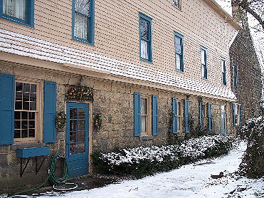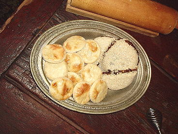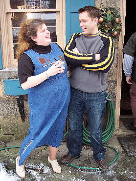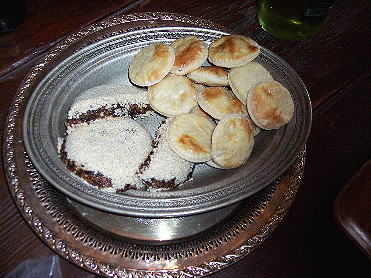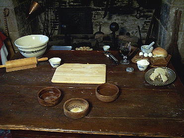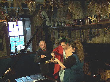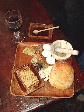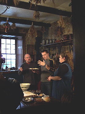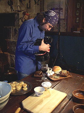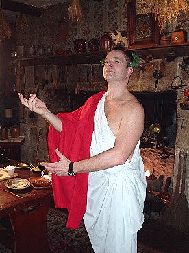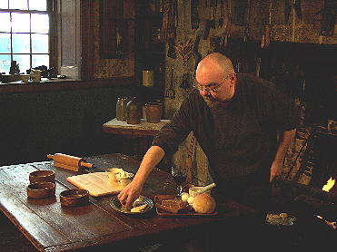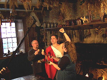 Dissolve the yeast and sugar in the wine; set aside. In a large bowl, mix together with your hands the flour and oil until it resembles course sand. Add the wine/yeast mixture and mix with hands until a ball of dough is formed. Add a little more flour if necessary. This should resemble bread or biscuit dough - stretchy & rubbery, but not too sticky. On a floured surface, knead the dough slightly until uniform in texture. Roll out on a floured surface into a flat, thin round. With a circular cutter approx. 1 1/2 inch in diameter, cut out small rounds of dough. Transfer with a floured spatula onto a baking sheet lined with parchment paper. Re-roll any leftover dough and continue cutting rounds until all the dough is used. Brush the cakes with the egg white. Bake in oven for 20 minutes. Cool cakes on a wire rack. Garnish or eat with honey. Yield: 1 dozen. (Source documentation will be included soon, along with our research notes.) ![]() Another shot of the cakes, on left. And now, here are some pictures taking during the Feb. 10th taping! These photographs (and the ones above) are by Jim Matterer & Darell McCormick. ![]() Our table set-up. ![]() ![]() Jim, Jim O'Connor, & Tammy during the taping. ![]() Fussing over the table. ![]() A picture of the exterior of the room used for the taping, on the left. ![]() ![]() Tammy & Jim O'Connor share a moment; the Food Network cameraman at work. ![]() Jim cogitates during a lull in taping. ![]() Troy Lamey & Jennifer Strobel observe the activity from a safe spot. ![]() Jim O'Connor, suitably dressed, prepares to sample the final product. ![]() "Hail, Caesar!" Jim O'Connor declares the wine cakes good. Behind -the-Scenes Video! Taping in progress. Hail Ceasar! Jim O'Connor in a toga! These photographs are by Tammy Crawford. ![]() The wine cakes & the nut cake. ![]() ![]() Roman food on the table; Jim O'Connor in his toga - made from the Inn's tablecloths! The Food Network webpage on this episode is at: http://www.foodnetwork.com/food/show_sf/episode/0,,FOOD_17616_37987,00.html |