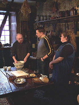 ![]() ![]() Gode Cookery's Jim Matterer & Food Network's Jim O'Connor. In early 2005 we were contacted by Stanley Brown & Kerry Lambert from Greystone TV about a 2nd season episode of the Food Network series, "The Secret Life of...", involving the history of birthday cakes & parties. Jim Matterer & Tammy Crawford agreed to meet with their film crew and host Jim O'Connor at the beautiful & historic Century Inn in Scenery Hill, Pennsylvania, site of last year's segment on trenchers shown in "The Secret Life of Sandwiches," which also featured Gode Cookery. (Information and pictures from 2004's taping is HERE.) Taping took place on February 10th. The subject was Roman Birthday Cakes - more realistically, on cakes used by Romans during celebrations, including birthdays. Jim & Tammy prepared for Jim O'Connor wine cakes, used by the Romans as libations to the gods & goddesses, and one of the more common cakes of the Roman period. ![]() Here are the wine cakes made by Jim for the show, on the right; on the left is a nut cake made by Tammy, also featured. Here is the recipe Jim created for the show: Roman Wine Cakes