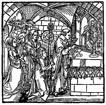 8. Demon causing women to gossip during Mass. From Geoffrey de Latour Landry's Ritter vom Turn, printed by Michael Furter, Basle, 1493.