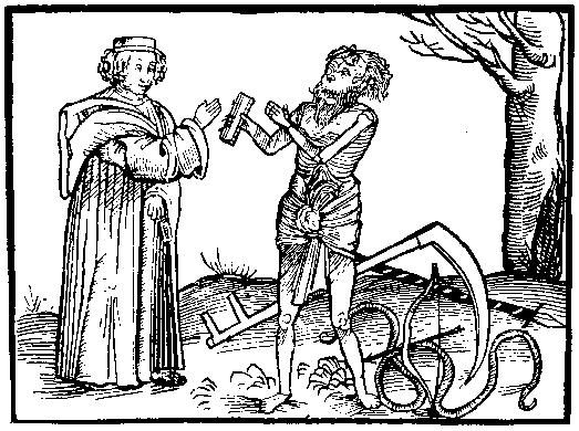 60. The physician's discussion with Death. From Strub's Orationes Dual, Vienna, 1511.