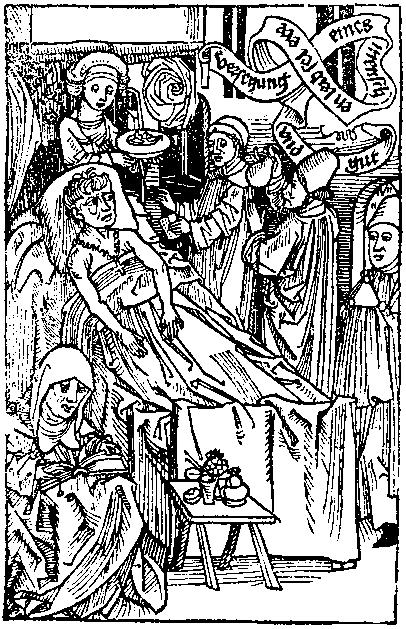 81. Dying man surrounded by his attendants. Attributed to Albrecht Dürer; from the title page of a German edition of Ars Moriendi, printed by Johann Weyssenberger, Nuremberg, 1509.