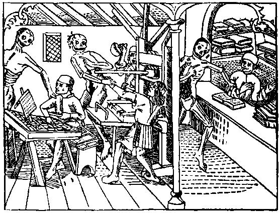 83. Typesetter, printer and bookseller. From La Grant Dance Macabre, printed by Matthias Huss, Lyons, 1499.