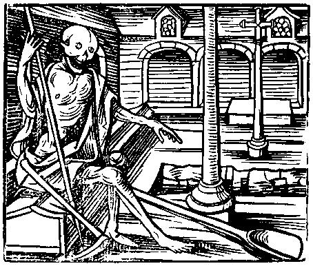 87. Death in the cloister. From Robert Gobin's Les Loups Ravissans (The Ravishing Wolves), printed by Antoine Verard, Paris, 1503.