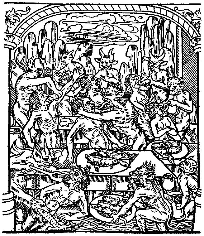 100. Infernal punishment for the Seven Deadly Sins: the gluttonous are forcefed on toads, rats, and snakes. From Le grant kalendrier des Bergiers, printed by Nicolas le Rouge, Troyes, 1496.