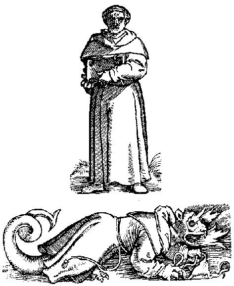 115. Martin Luther's triumph over the monk's devil. From Mattheus Gnidius' Dialogi, a Reform pamphlet against the Papists Murner and Weddel, Germany, 1521.