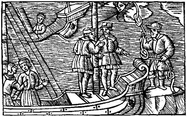 132. Sorcerer selling a bag of wind (tied up in three knots of a rope). From Olaus Magnus' Historia de gentibus Septentrionalibus, Rome, 1555.