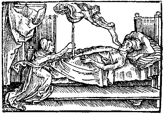 147. The Angel of Death, taking the soul, in the form of a child, from a dying man. From Reiter's Mortilogus, printed by Oegelin and Nadler, Augsburg, 1508.