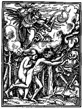 Adam and Eve are preceded by Death, who plays on a vielle, or beggar's