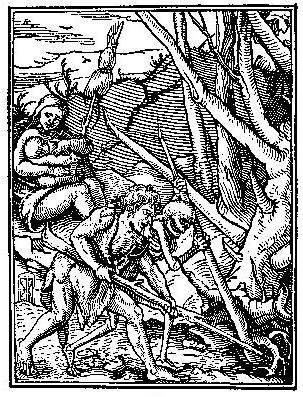 Eve is suckling her first-born, and holding a distaff. Whence the proverb