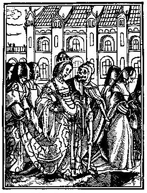 Gorgeously attired and attended by her maids of honour, she is intercepted