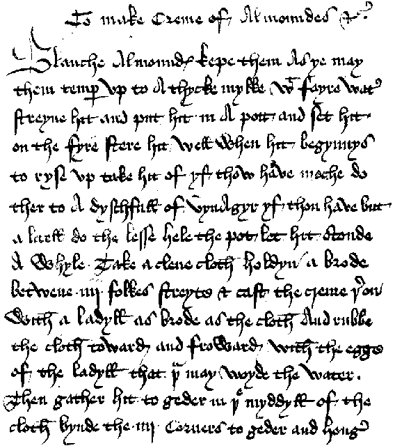 To make Creme of Almoundes PERIOD: England, late 15th c. | SOURCE: MS Pepys 1047 | CLASS: Authentic DESCRIPTION: A thick cream made of almond milk.